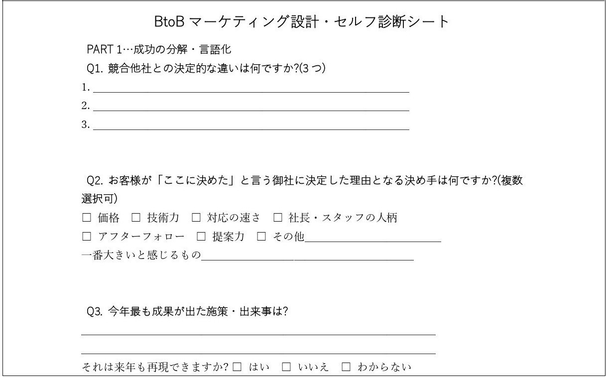 このブログの最後には▼営業を増やさないで、マーケティングか活用できる会社のための【BtoBマーケティング設計・セルフ診断シート】▼があります。