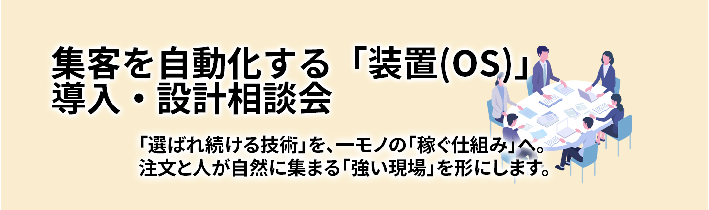 30年の現場での集客経験から導き出した「売れる型」を組み込み、社長が動かなくても「自前で客を連れてくる」、24時間稼働の営業ライン(仕組み)を構築することです。