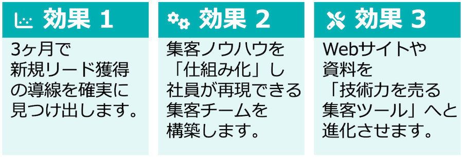 | 単発の成果で終わらず、今後も継続して新規顧客を獲得できる「会社の資産となる集客の仕組み」が手に入ります。 |